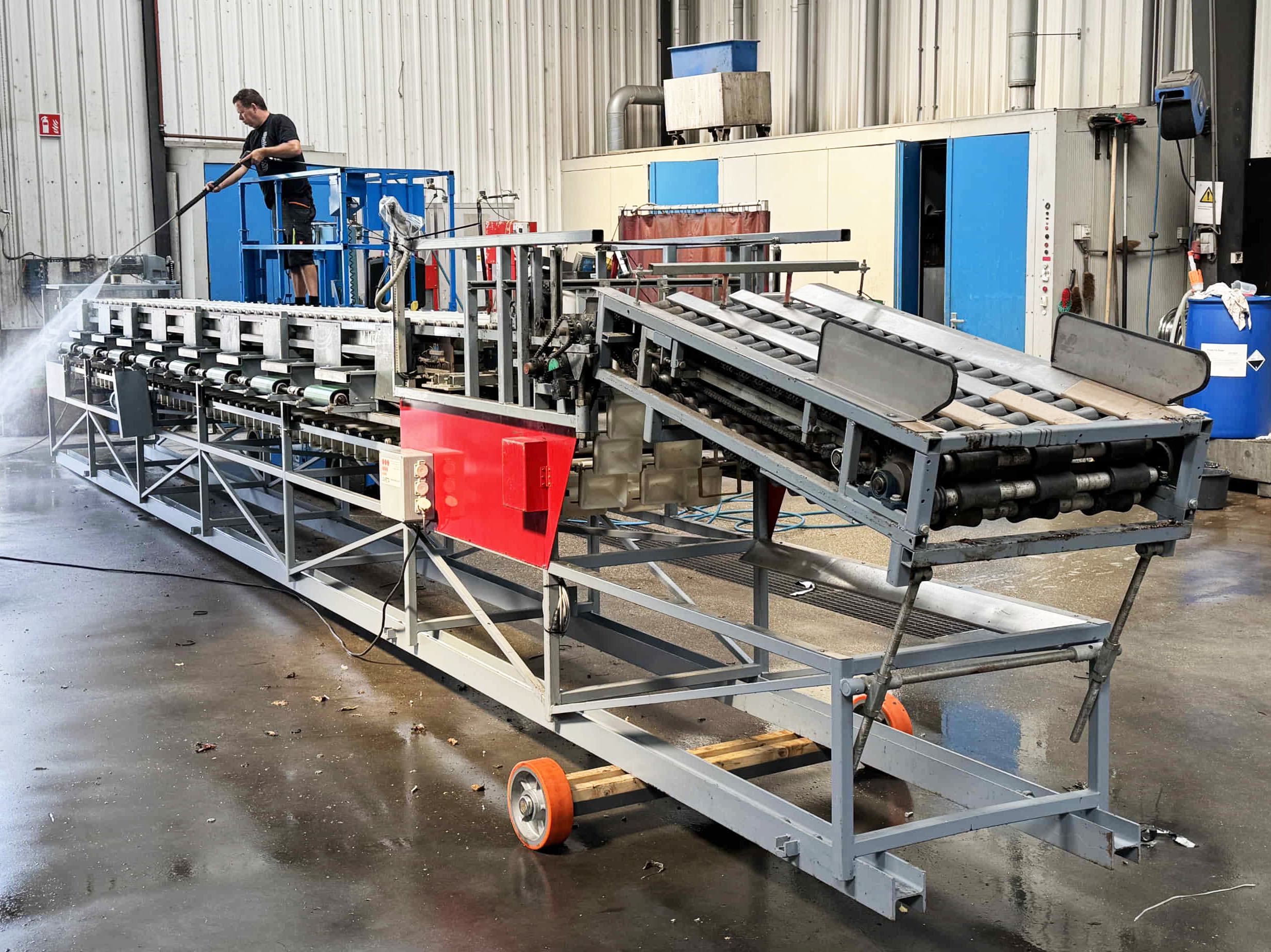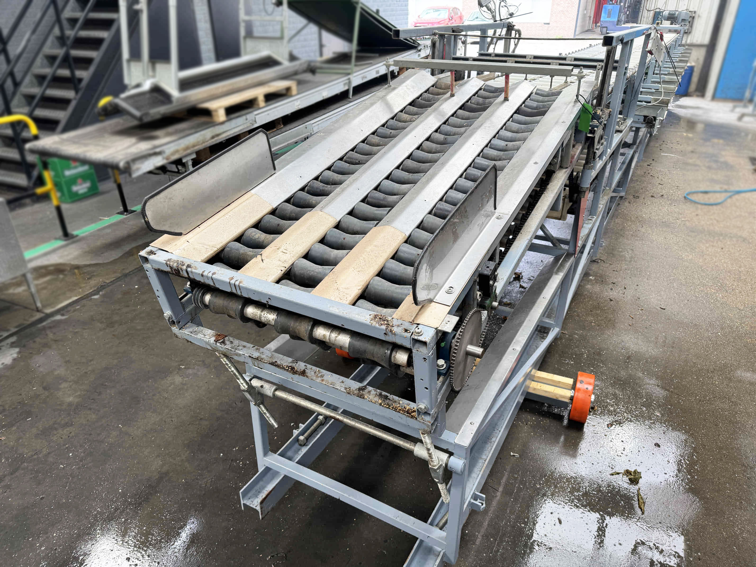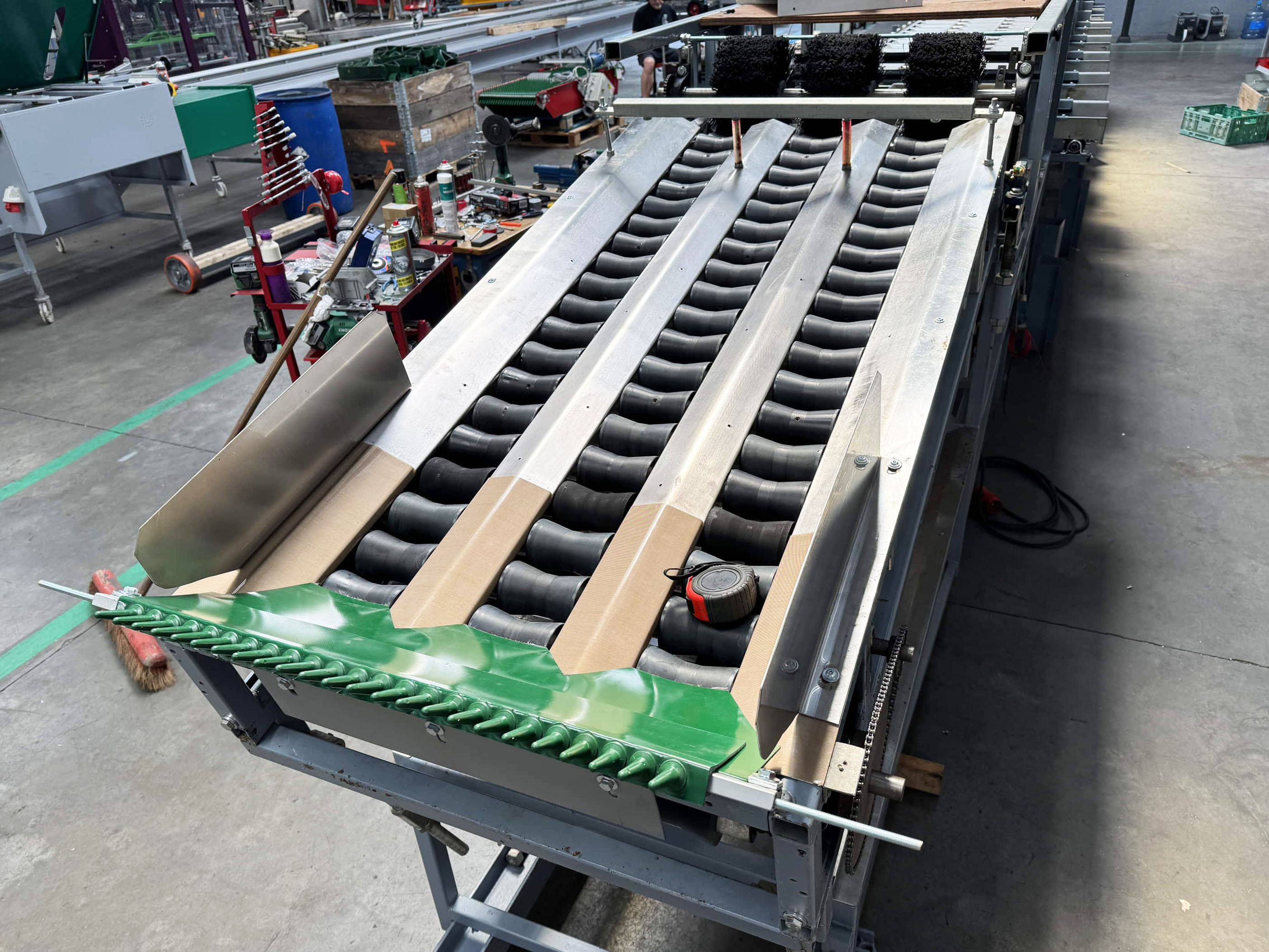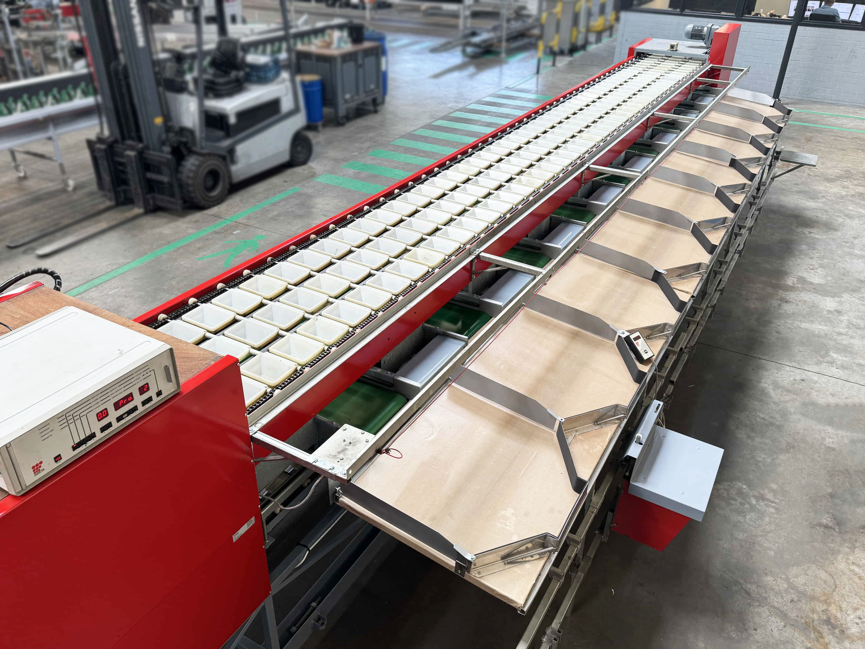Diese Aweta-Sortiermaschine wurde von uns für einen Kunden in den Vereinigten Staaten komplett überholt. Die Maschine wurde gründlich gereinigt, wo nötig neu lackiert/gestrichen und mit neuen Teilen ausgestattet. Nach der Überholung wurde die Maschine ausgiebig mit dem Produkt des Kunden getestet. Außerdem wurde die Sortiermaschine mit einem Bunkerband, einem Förderband und digitalen Waagen an den Ausgängen der Maschine ausgestattet.