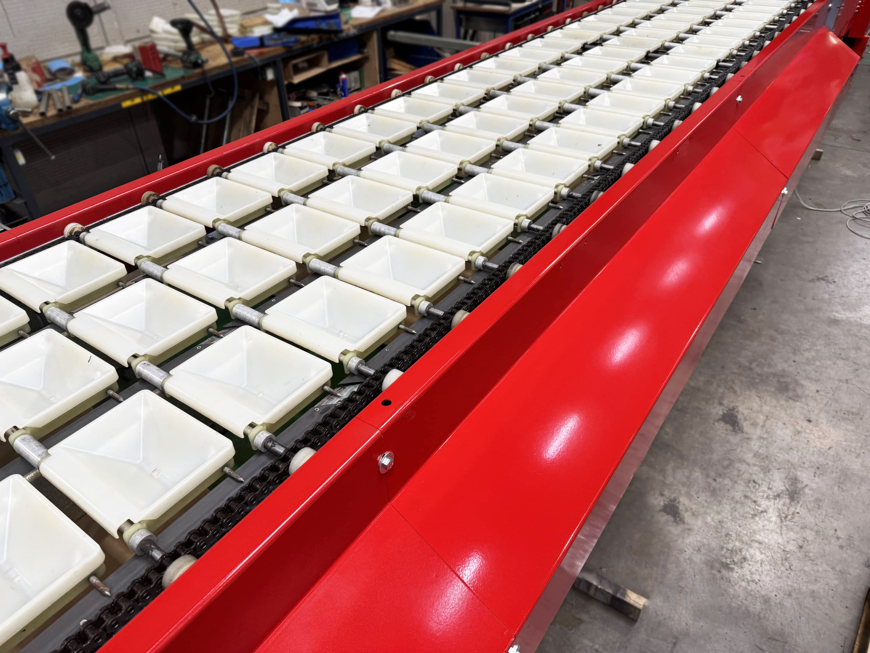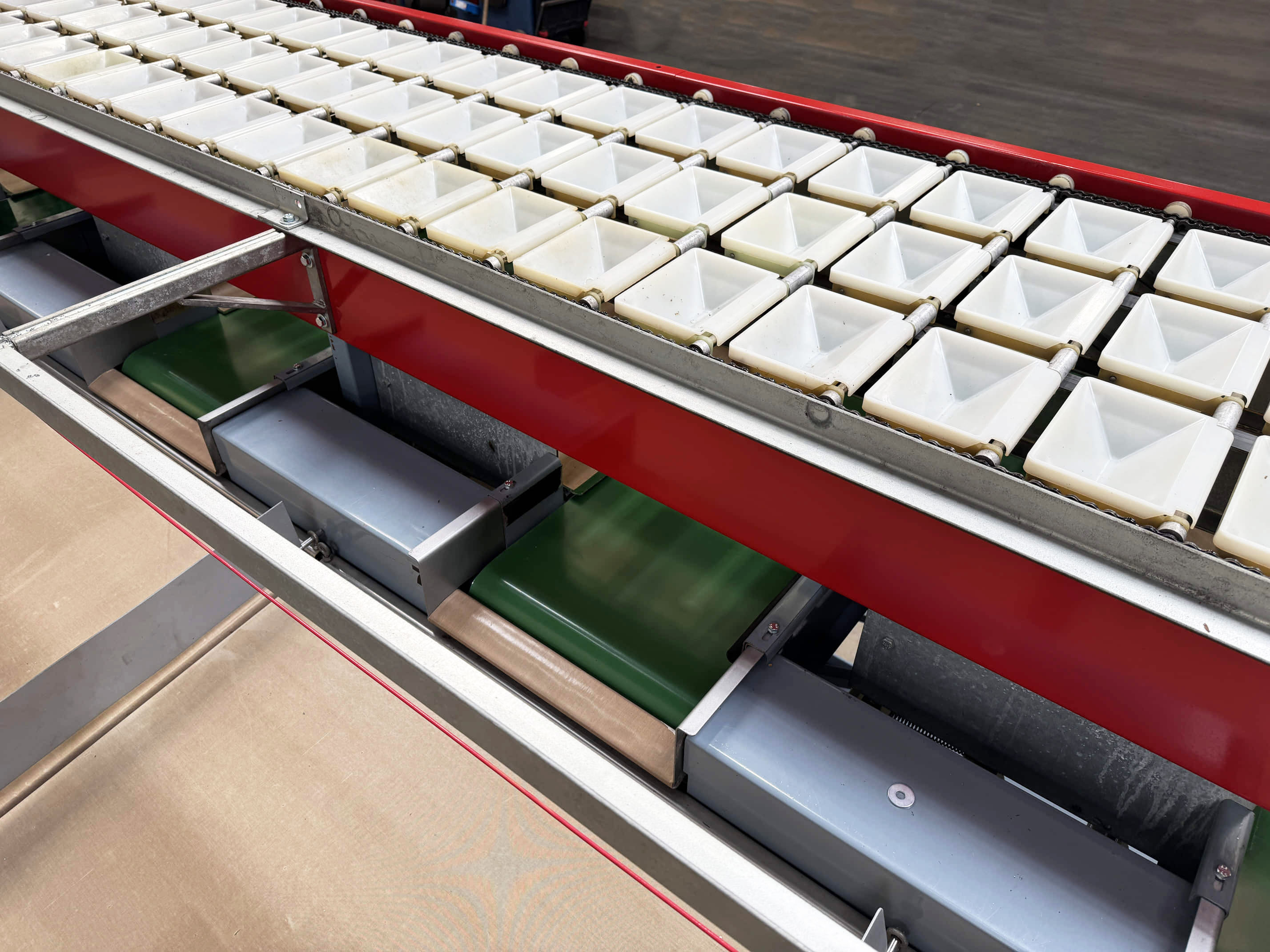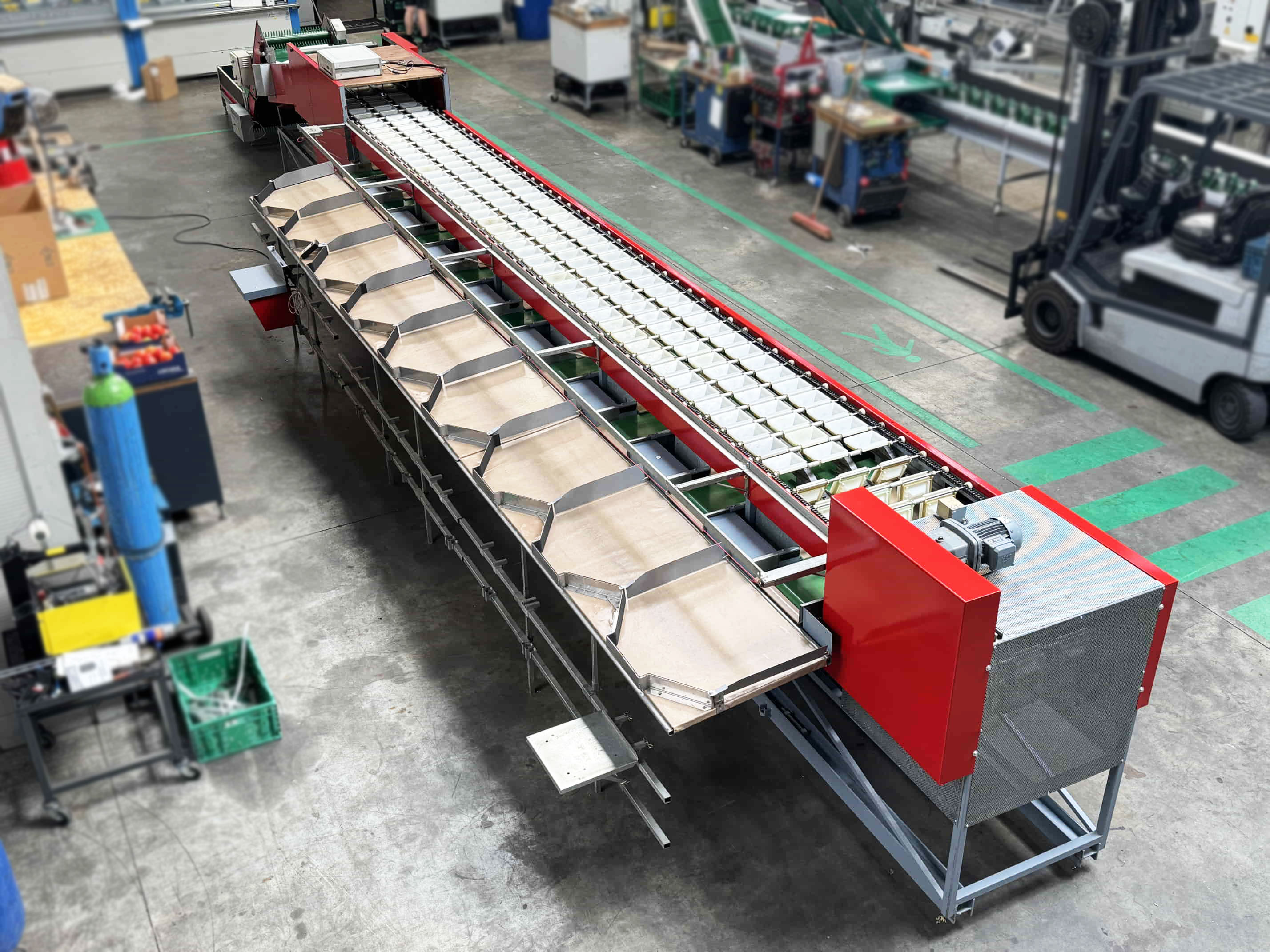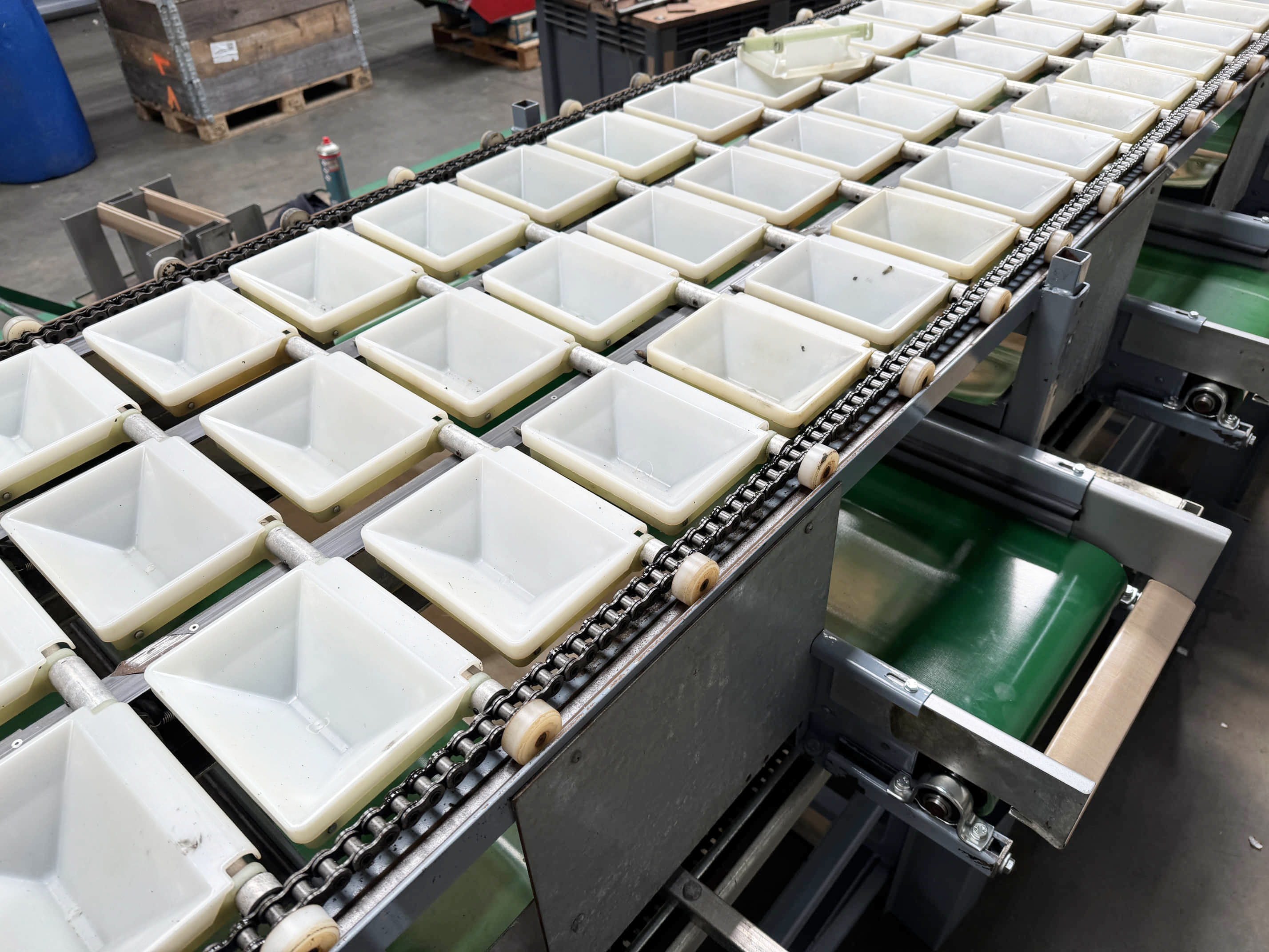 Diese Aweta-Sortiermaschine wurde von uns für einen Kunden in den Vereinigten Staaten komplett überholt. Die Maschine wurde gründlich gereinigt, wo nötig neu lackiert/gestrichen und mit neuen Teilen ausgestattet. Nach der Überholung wurde die Maschine ausgiebig mit dem Produkt des Kunden getestet. Außerdem wurde die Sortiermaschine mit einem Bunkerband, einem Förderband und digitalen Waagen an den Ausgängen der Maschine ausgestattet.