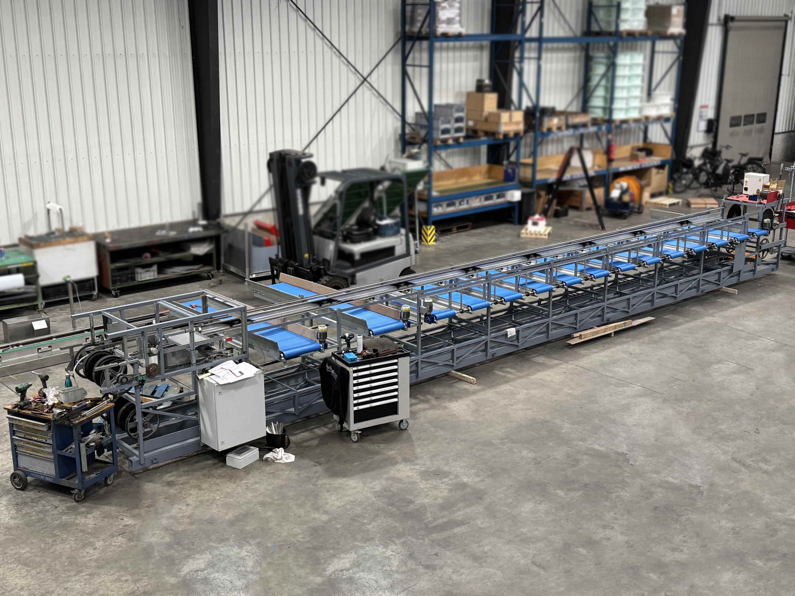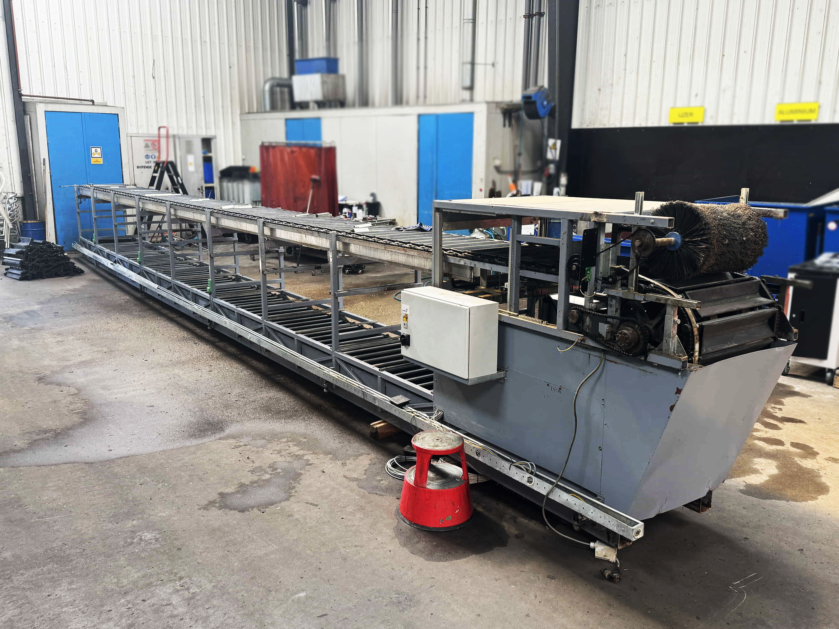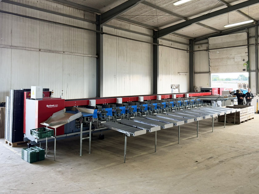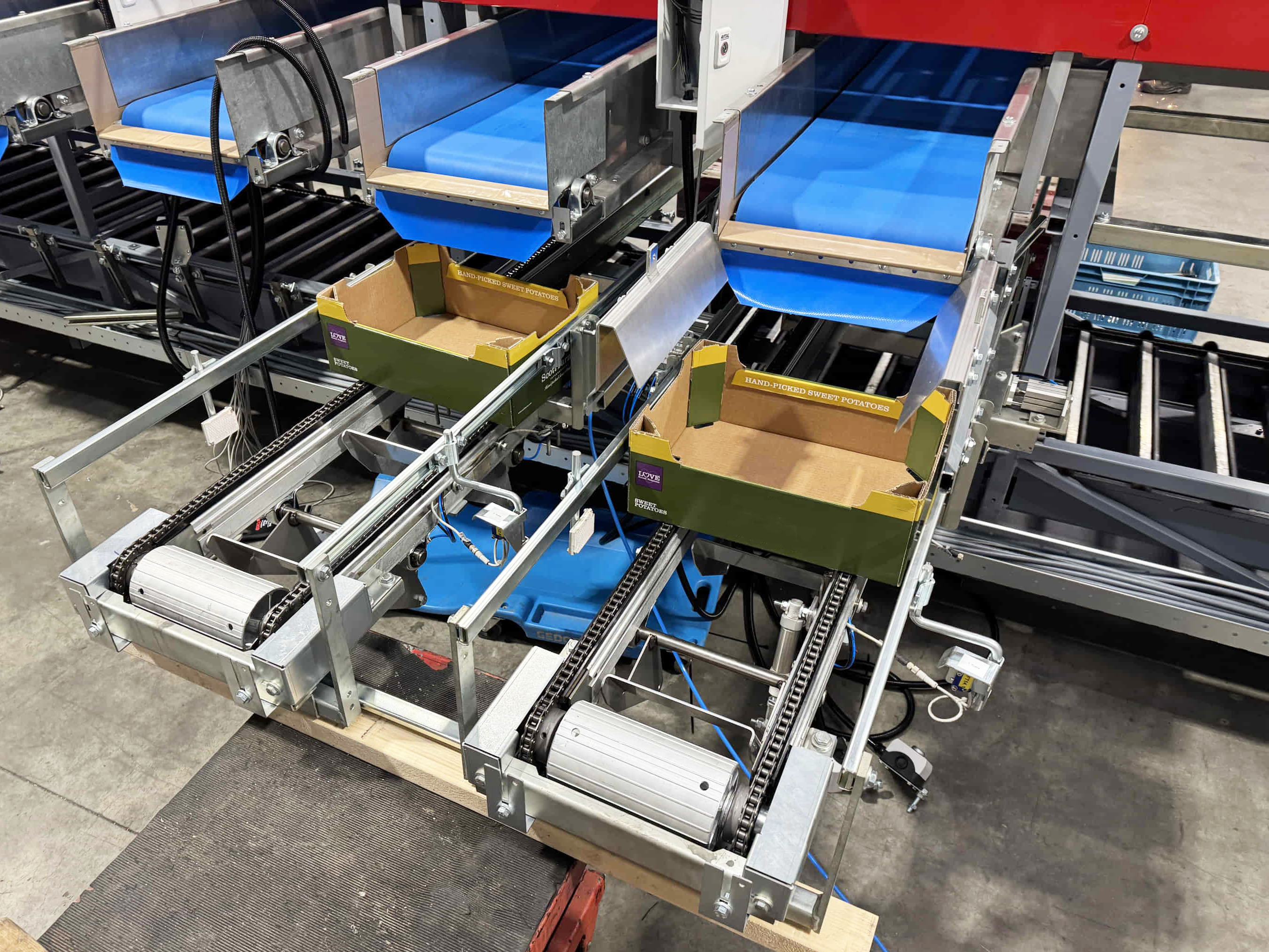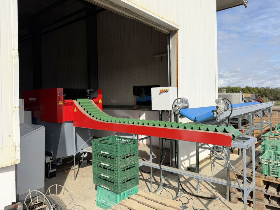 Para este proyecto, se revisó por completo una clasificadora de pepinos existente y se convirtió en una clasificadora de boniato para un cliente en Portugal. La máquina se equipó con una correa trapezoidal, un transportador de entrada y salidas automatizadas mediante transportadores de cadena y transportadores de rodillos de descarga.
