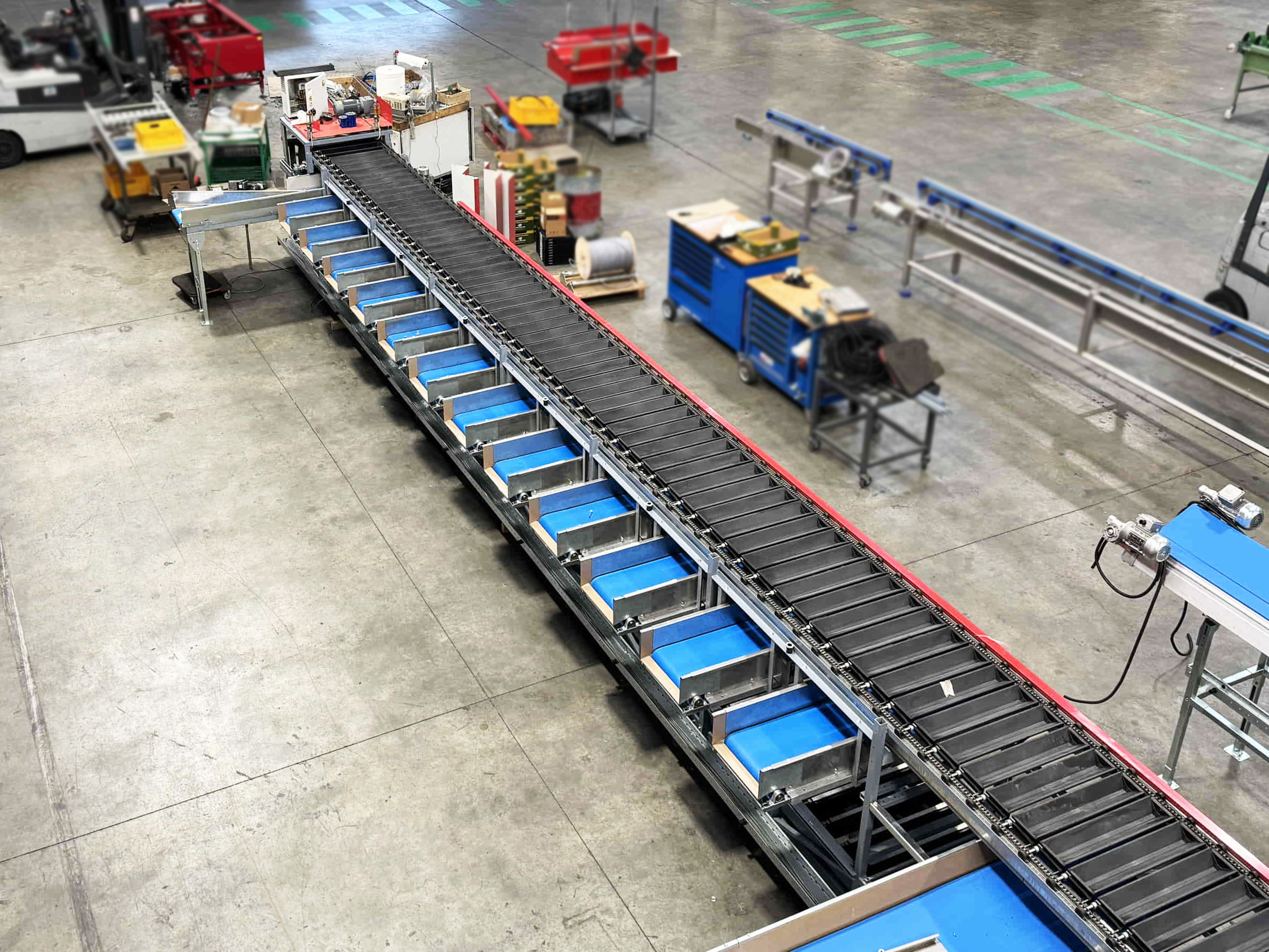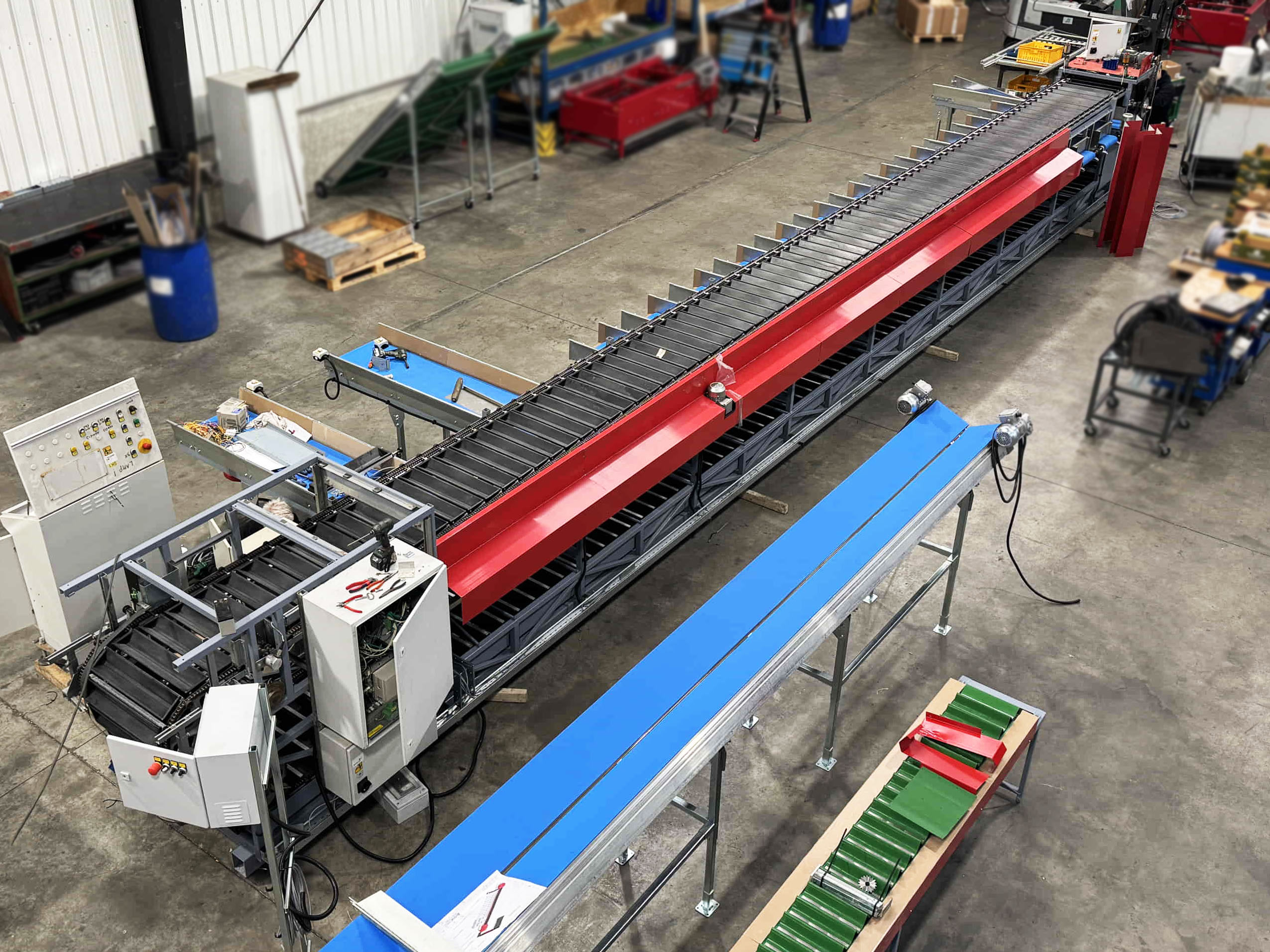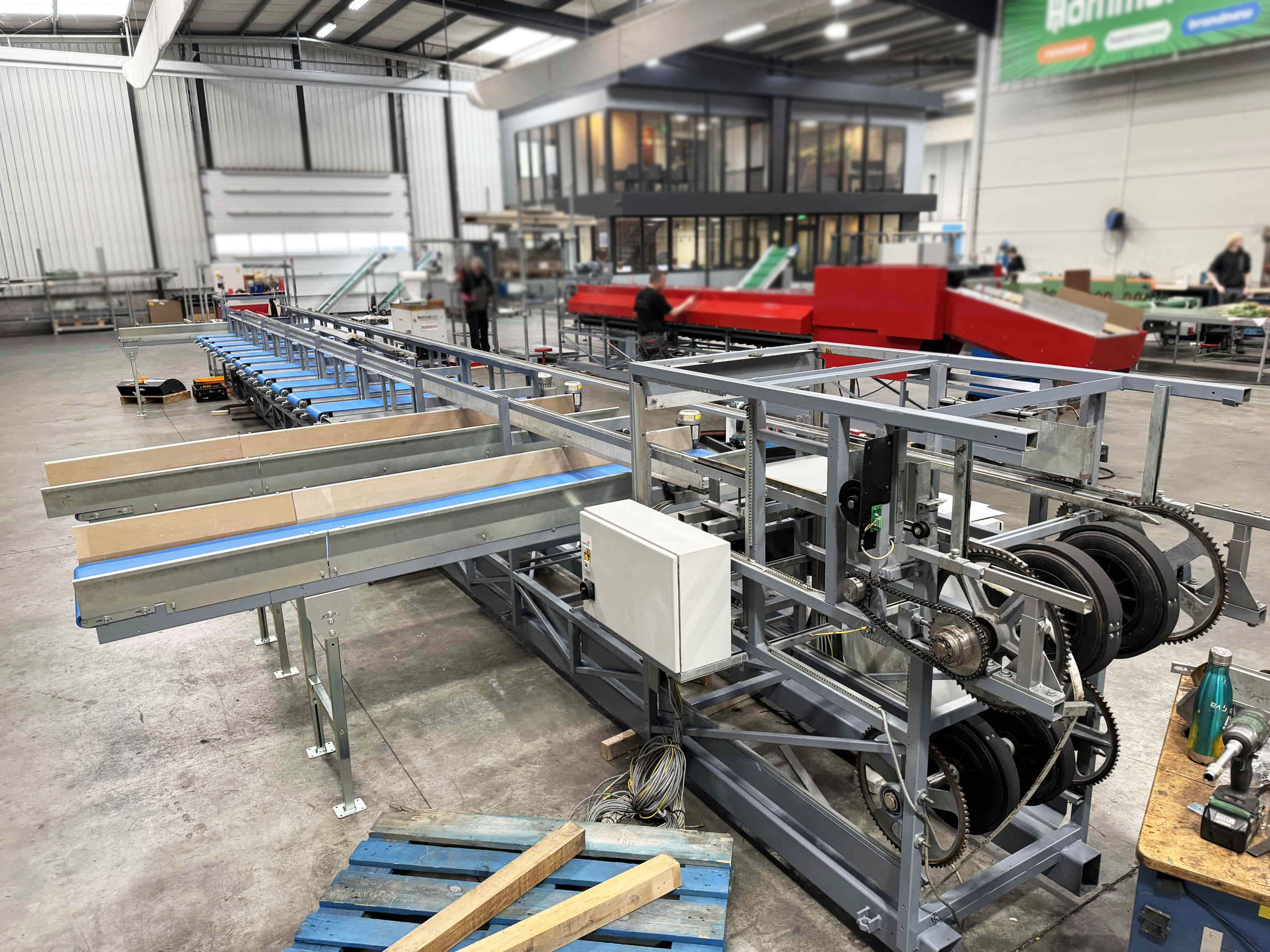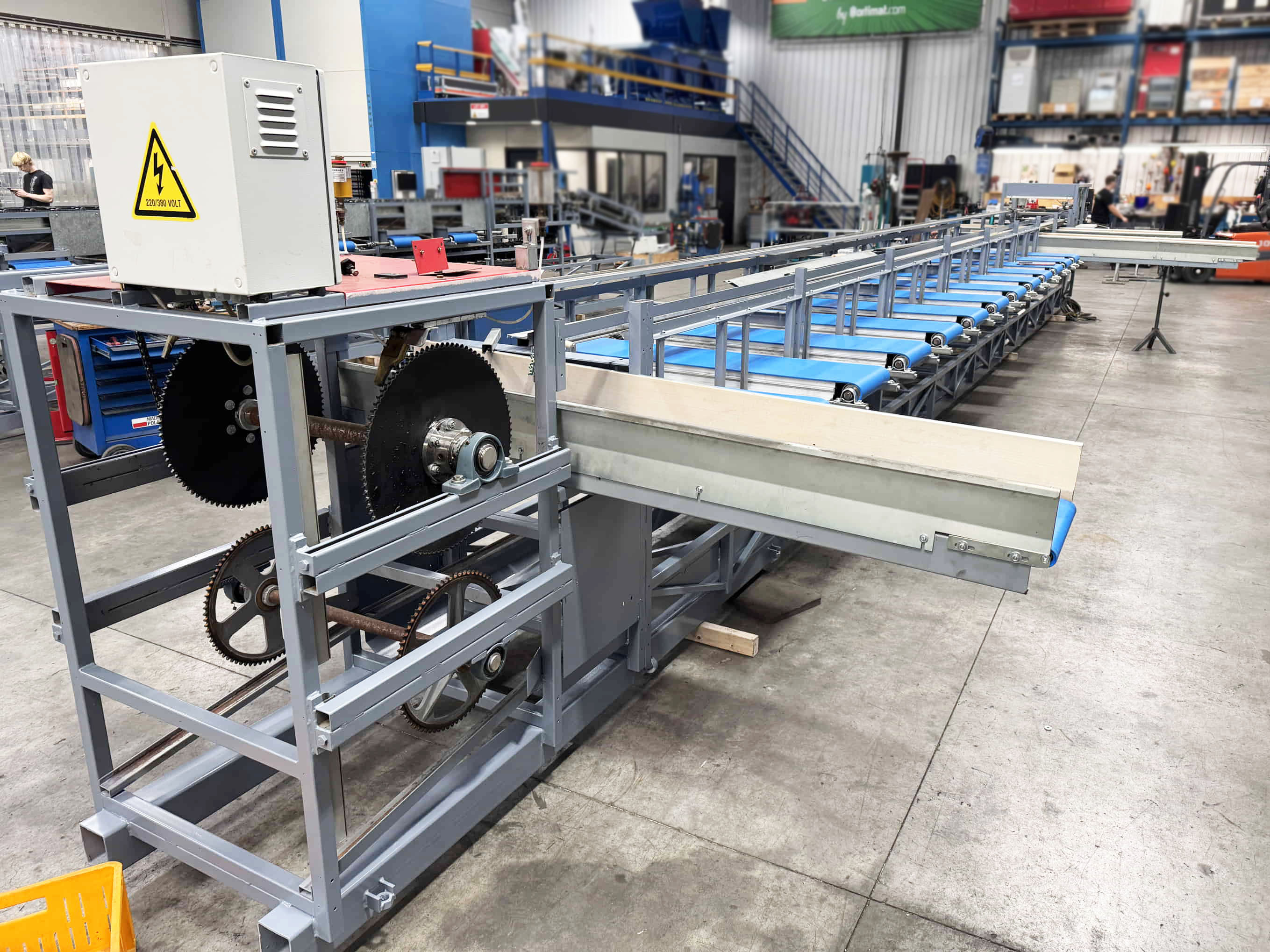 Para este proyecto, se revisó por completo una clasificadora de pepinos existente y se convirtió en una clasificadora de boniato para un cliente en Portugal. La máquina se equipó con una correa trapezoidal, un transportador de entrada y salidas automatizadas mediante transportadores de cadena y transportadores de rodillos de descarga.