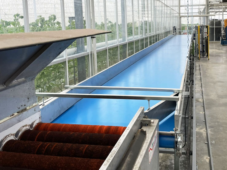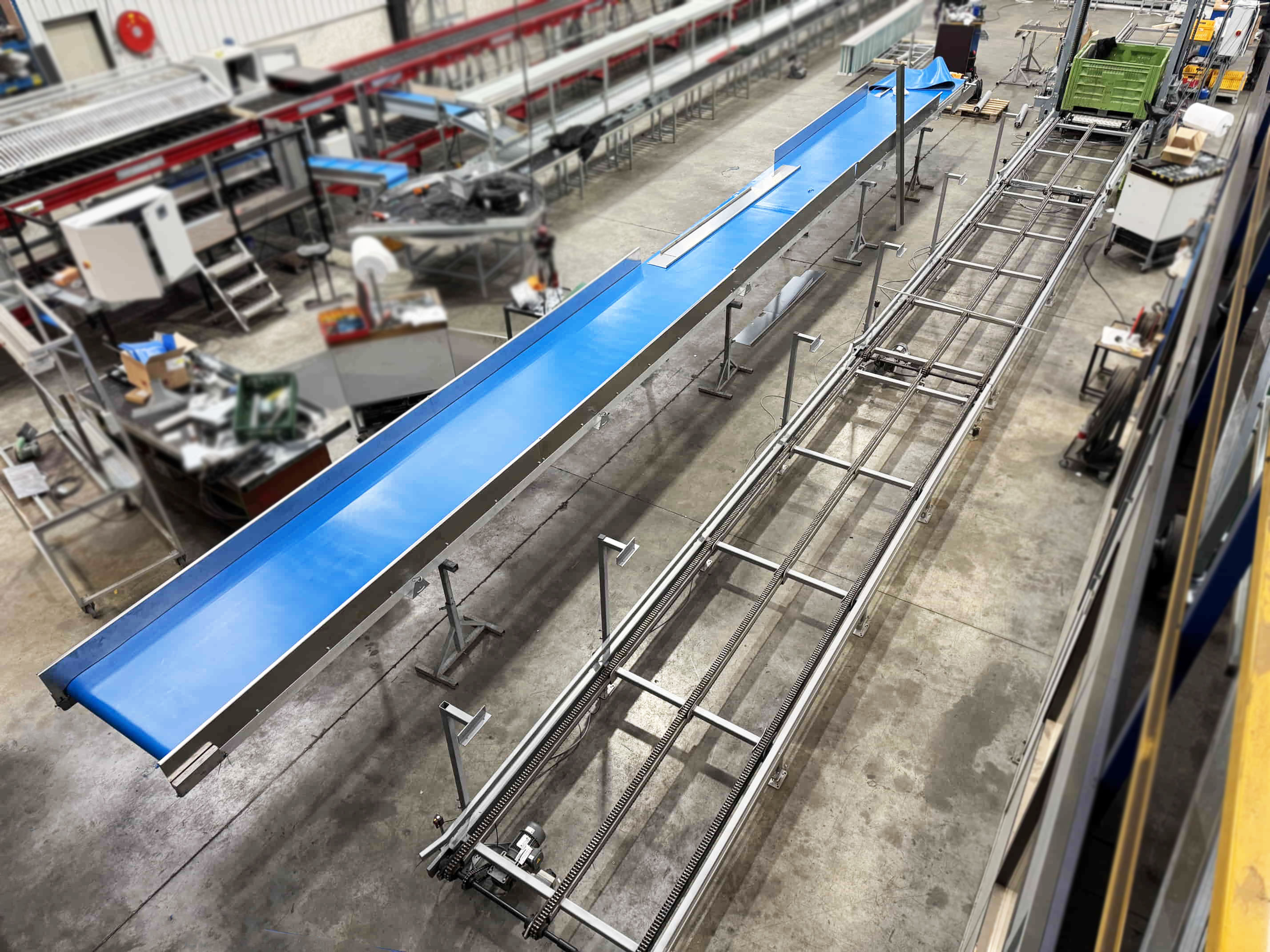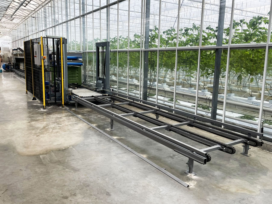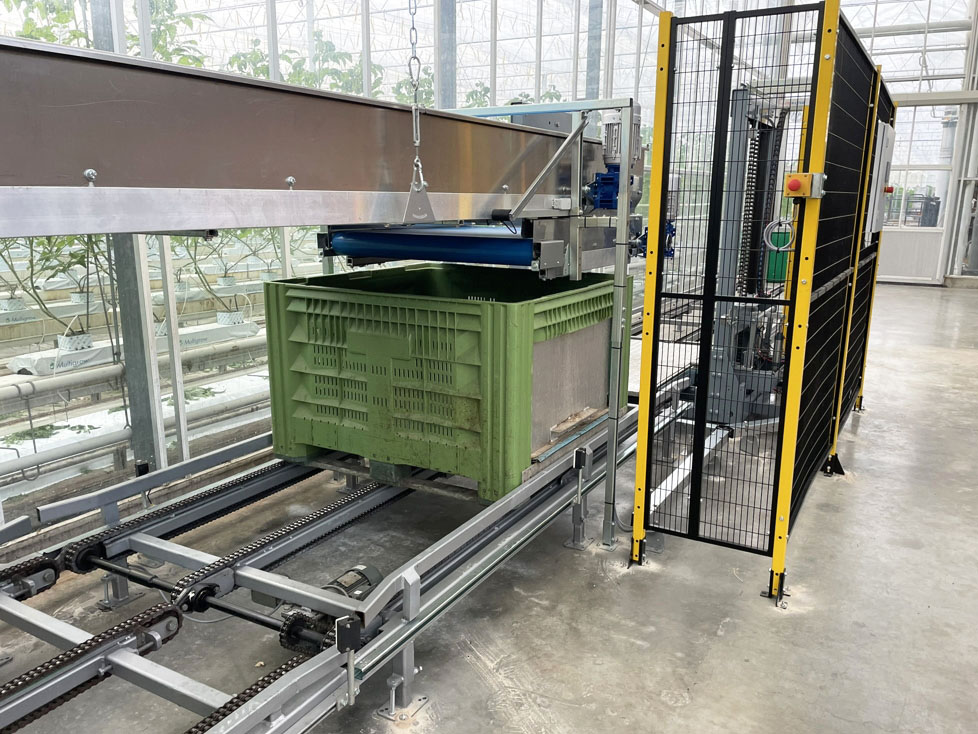 Voor een klant in Nederland heeft Hortimat een geautomatiseerd kistenvulsysteem gerealiseerd voor het vullen van m³-kisten met tomaten. De kisten worden via een kettingbaan één voor één ontstapeld en naar de vulpositie gebracht. Vanuit de kas worden de tomaten aangevoerd naar een bufferband die richting de vulpositie leidt. Na het vullen kan de volle kist onder de bufferband worden gebufferd en afgevoerd.