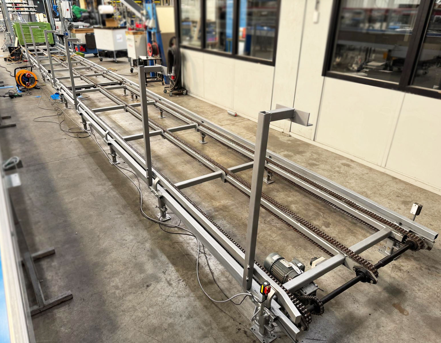 Hortimat ha creado un sistema automático de llenado de cajas para un cliente en los Países Bajos, que sirve para llenar cajas de un metro cúbico con tomates. Las cajas se desapilan una a una mediante una cadena transportadora y se llevan a la posición de llenado. Los tomates se transportan desde el invernadero hasta una cinta transportadora que los lleva a la posición de llenado. Después del llenado, la caja llena se puede almacenar debajo de la cinta transportadora y retirarse.